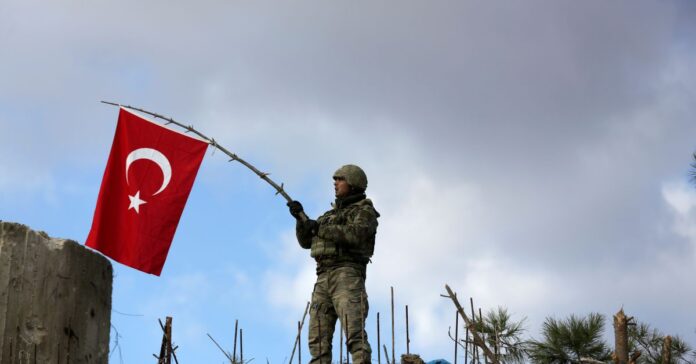 A Turkish soldier waves a flag on Mount Barsaya, northeast of Afrin, Syria January 28 ,2018. REUTERS/ Khalil Ashawi/File Photo