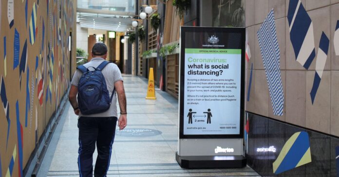 A man walks in a corridor near a sign with instructions about the coronavirus and social distancing following the implementation of stricter social-distancing and self-isolation rules to limit the spread of the coronavirus disease (COVID-19) in Sydney, Australia, March 31, 2020. REUTERS/Loren Elliott
