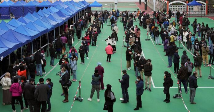 People wearing face masks line up at a testing centre for the coronavirus disease (COVID-19) in Hong Kong, China February 23, 2022. REUTERS/Lam Yik