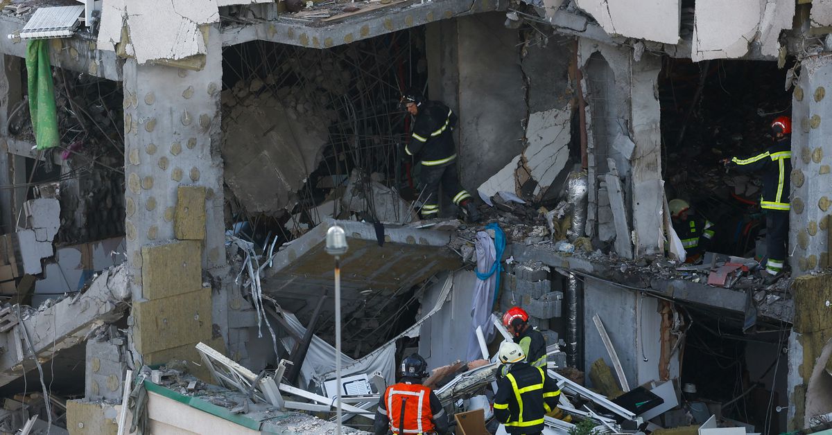 [1/2]Rescuers work at the site of an apartment building damaged during Russian missile strikes, amid Russia’s attack on Ukraine, in Kyiv, Ukraine June 24, 2023. REUTERS/Valentyn Ogirenko