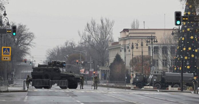 Kazakh service members stand guard at a checkpoint following the protests triggered by fuel price increase in Almaty, Kazakhstan January 7, 2022. REUTERS/Mariya Gordeyeva