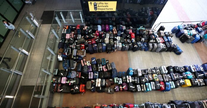 Lines of passenger luggage lie arranged outside Terminal 2 at Heathrow Airport in London, Britain, June 19, 2022. REUTERS/Henry Nicholls/File Photo