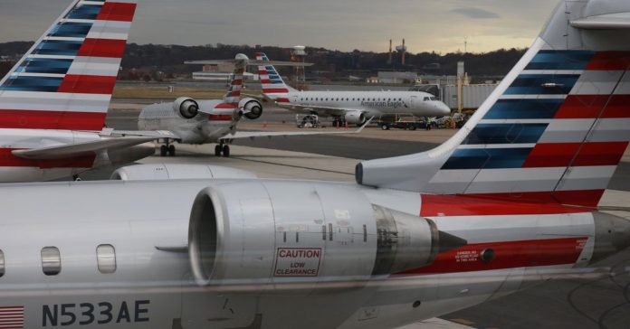 [1/3]A jet from American Eagle, a regional branch of American Airlines (AA), taxis past other AA aircraft at Ronald Reagan Washington National Airport in Arlington, Virginia, U.S. December 3, 2021. REUTERS/Chris Helgren/File photo