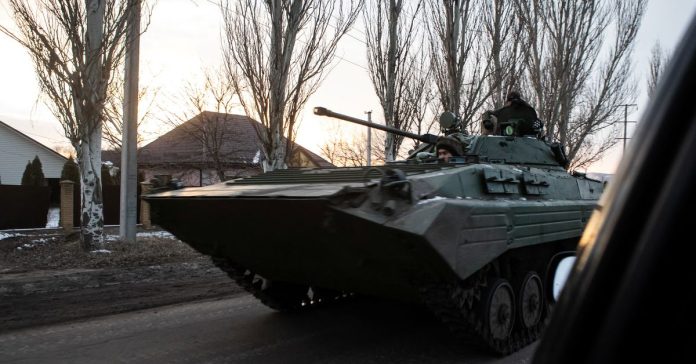 [1/3]Â Ukrainian servicemen drive along a street with BMP-2 infantry fighting vehicle in the frontline town of Bakhmut, amid Russia’s attack on Ukraine, in Donetsk region, Ukraine February 9, 2023. REUTERS/Yevhenii Zavhorodnii