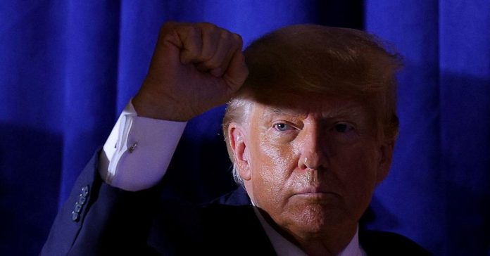 [1/3] Former U.S. President and Republican presidential candidate Donald Trump gestures during a campaign event in Manchester, New Hampshire, U.S., April 27, 2023. REUTERS/Brian Snyder