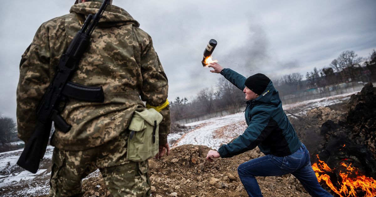 A civilian trains to throw Molotov cocktails to defend the city, as Russia’s invasion of Ukraine continues, in Zhytomyr, Ukraine March 1, 2022. REUTERS/Viacheslav Ratynskyi