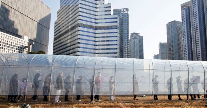 People wait in a line to undergo coronavirus disease (COVID-19) testing at a temporary testing site set up at a railway station in Seoul, South Korea, December 8, 2021. REUTERS/Heo Ran