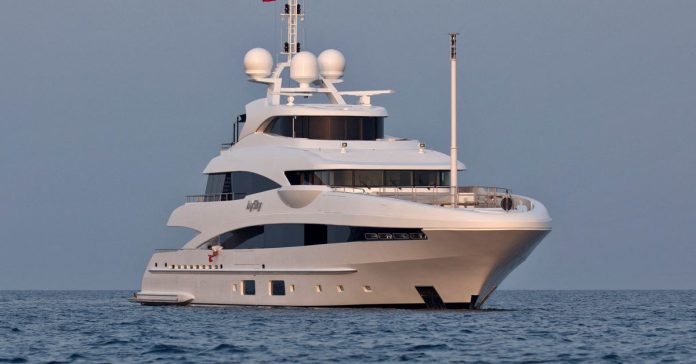 The yacht named MySky features “ultra-modern sophisticated interiors” by a well-known Dutch architect, an “indoor climate controlled gymnasium” and a deck that can be used for landing helicopters, according to the advertisement.