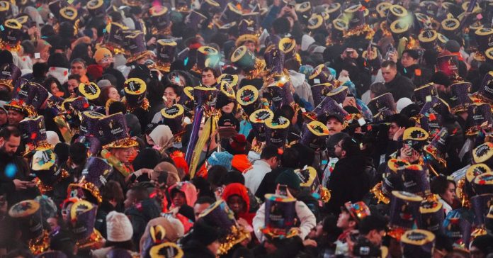 New York rang in the new year in typical style on Saturday evening as thousands of people corralled themselves into pens under pouring rain in Times Square, waiting to see a glittering ball glide down a pole mounted atop a tall building in the year’s final seconds.