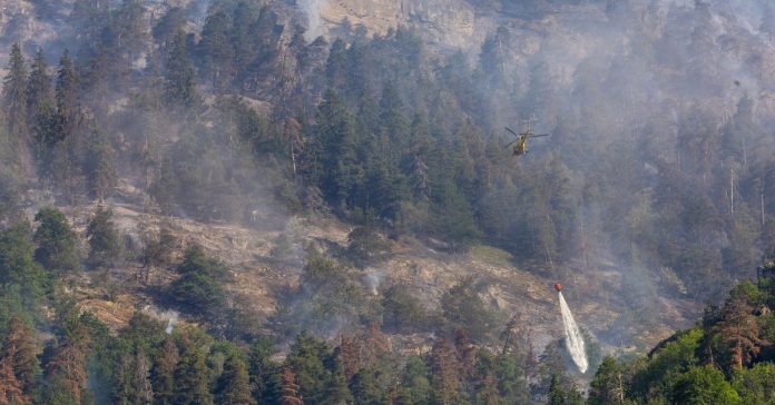 The fire broke out on Monday on the forested flank of a mountain in Bitsch in the Valais canton near the Italian border. Helicopters hovered overhead throughout the night to drop water onto the blaze.