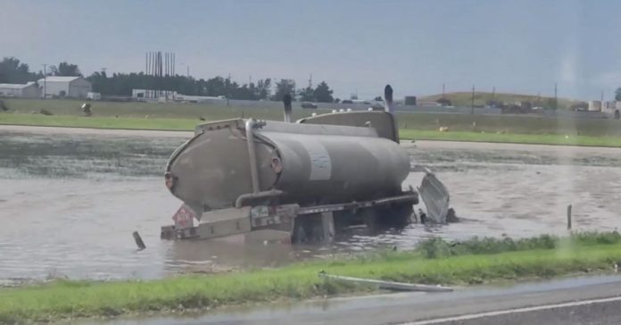 [1/5] A tank truck gets partially submerge in water in Perryton as the town gets struck by a tornado, in Texas, U.S. June 15, 2023, in this screengrab obtained from a social media video. Sabrina Devers via TMX/via REUTERS