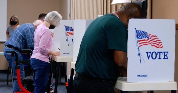 Voter mark their ballots during the primary election and abortion referendum at a Wyandotte County polling station in Kansas City, Kansas, U.S. August 2, 2022. REUTERS/Eric Cox