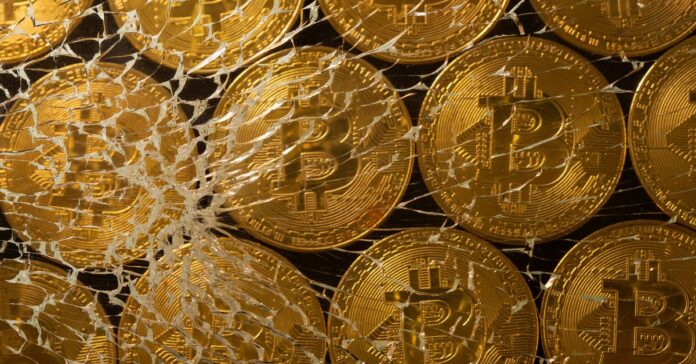 Representations of virtual currency bitcoin are seen through broken glass in this illustration taken, June 25, 2021. REUTERS/Dado Ruvic/Illustration